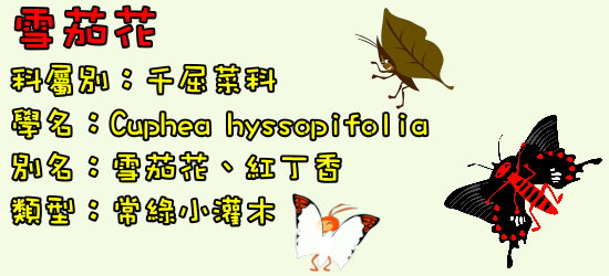 雪茄花以花形似“雪茄”而得名。葉序單葉對生,葉形為線形披針形,葉端漸尖,葉基漸狹。喜陽光充足及溫暖的環境,耐寒也耐熱,耐濕。全株枝幹平滑,花小而密生,全年可開花。植物在大自然中為了繁衍後代,常藉由昆蟲授粉,雪茄花也不例外,它靠著豔麗的花朵來吸引蝴蝶採蜜,並藉此完成繁衍的工作。