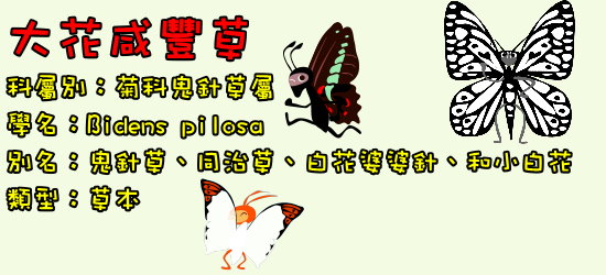 大花咸豐草是外來種植物,多年生草本,因適應良好,全台低海拔地區的荒廢地隨處可見。它的葉對生,三出複葉或五葉,小葉卵形或卵橢圓形。頭狀花序呈繖形狀排列,基部有細毛。瘦果會牢牢的附在人們的衣物上,因為上有宿存萼,所以刺入衣物細縫甩都甩不掉。大花咸豐草四季開花,是重要的蜜源植物,花粉產量大,可供昆蟲採集利用。